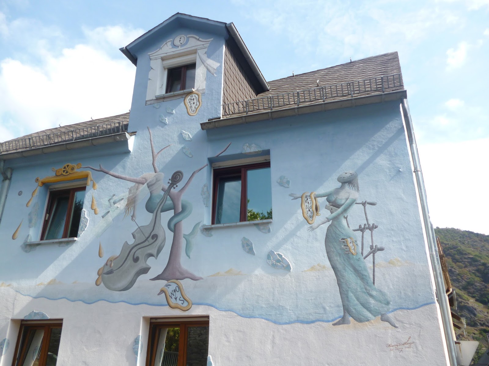 en er hangt een enorme beeldengroep waarvan ik de oorsprong niet heb gevraagd want de gids had een leuk verhaal over de tragedie van Idilia Dubb. Oude krantenartikelen hangen aan de muur. Zij was een engels meisje dat in de buurt logeerde en er dagelijks op uit ging met haar schetsboek. Ze stuitte op de ruïne van het kasteel en klom op de hoge toren. De vergane houten ladder brak achter haar in stukken en zij kon niet meer terug. De burcht was zeer afgelegen en niemand kon haar horen. Haar resten zijn 15 jaar later gevonden samen met haar dagboek "van een langzame dood" dat ze bijhield in haar schetsboek. Dik zal t niet zijn geweest. Nog jaren lang is men bang geweest dat zij daar rondspookte... Helaas heb ik haar niet gezien.